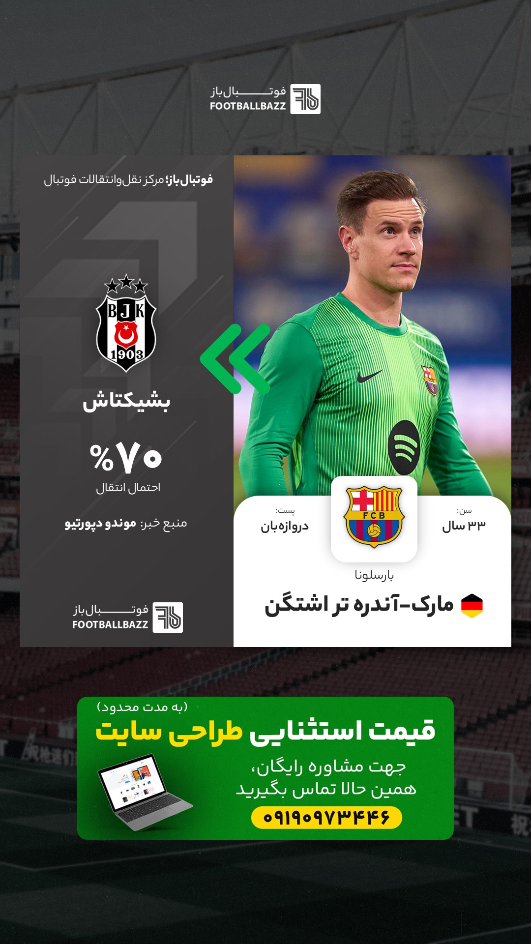 بشیکتاش به دنبال جذب قرضی تر اشتگن: باشگاه بشیکتاش ترکیه به دنبال جذب قرضی مارک آندره تر اشتگن، دروازه‌بان آلمانی بارسلونا، در پنجره زمستانی است. تر اشتگن برای بازگشت به فرم ایده‌آل و حضور در جام جهانی به بازی‌های بیشتری نیاز دارد، اما ظاهراً فلیک (سرمربی بارسا) قصد از دارد خوان گارسیا در ترکیب اصلی تیمش استفاده کند.