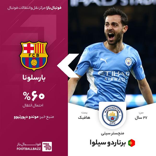 🔁 روزنامه موندو دپورتیوو مدعی شد: برخلاف باور مطبوعات انگلیسی، برناردو سیلوا می‌تواند در تابستان پیش‌رو به بارسلونا بپیوندد. پپ گواردیولا در ماه‌های اخیر به سیلوا گفته است که اگر پیشنهاد خوبی نصیب او شود که به‌نفع سیتیزن‌ها باشد به او اجازه خروج می‌دهد.