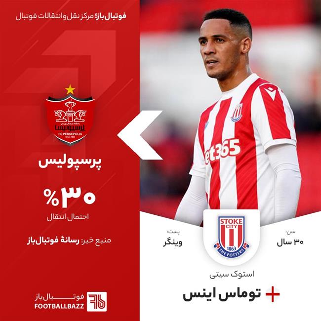 🔁 به گزارش رسانه فوتبال‌باز: نام یک بازیکن جدید برای انتقال به پرسپولیس به گوش می‌خورد. توماس اینس، مهاجم تیم استوک سیتی که سابقۀ پوشیدن پیراهن تیم ملی جوانان انگلیس و جوانان لیورپول را دارد، مدنظر یحیی گل‌محمدی قرار گرفته است. باید ببینیم آیا شاهد حضور یک بازیکن باکیفیت خارجی در پرسپولیس خواهیم بود یا خیر؟